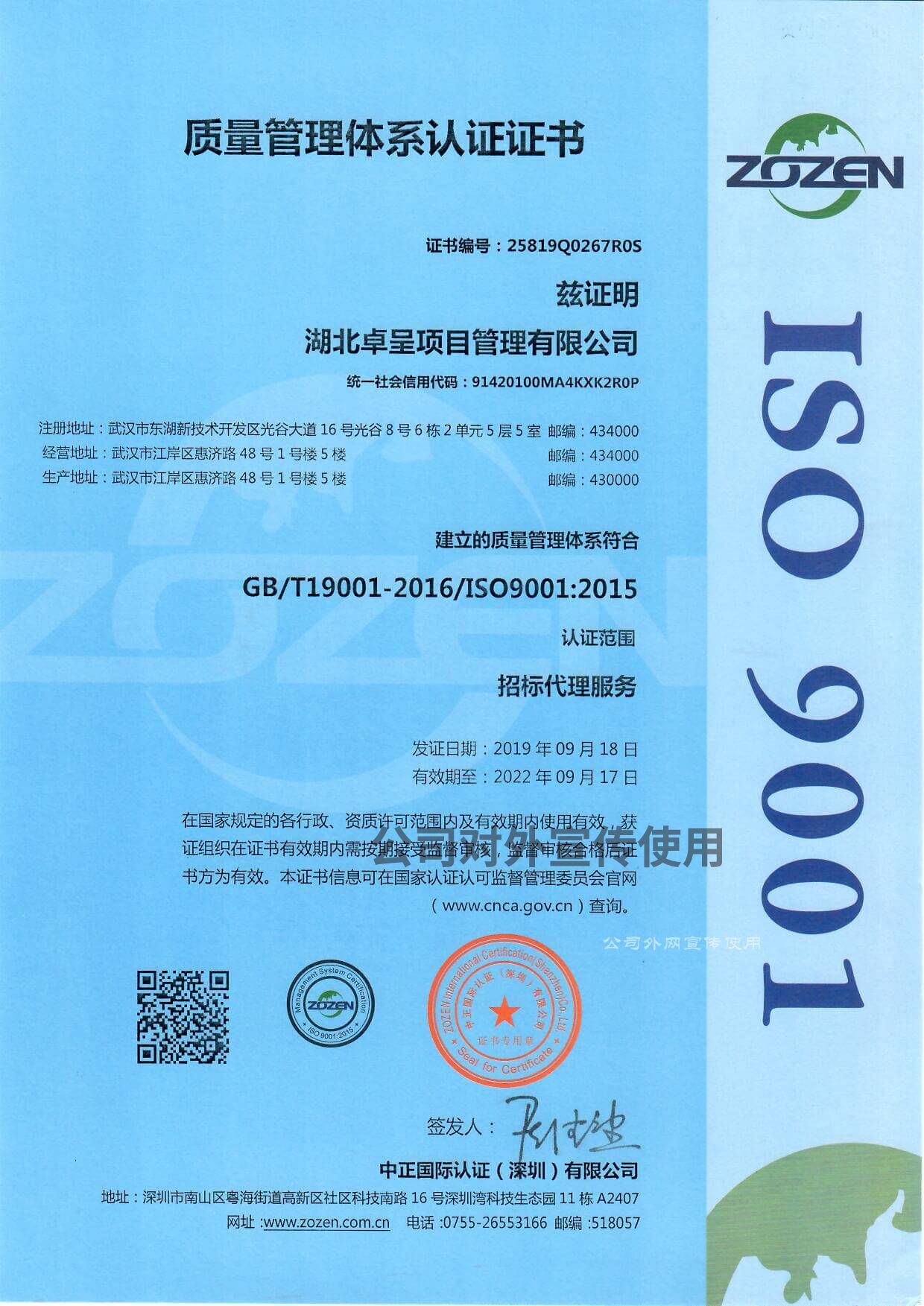 質(zhì)量管理體系認證證書